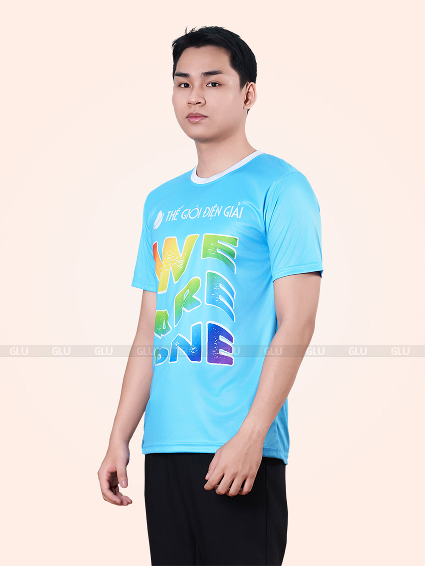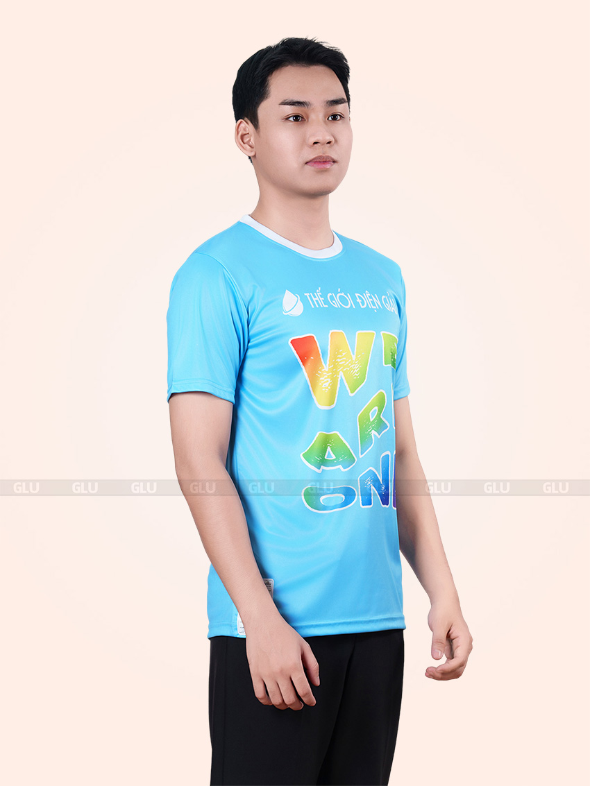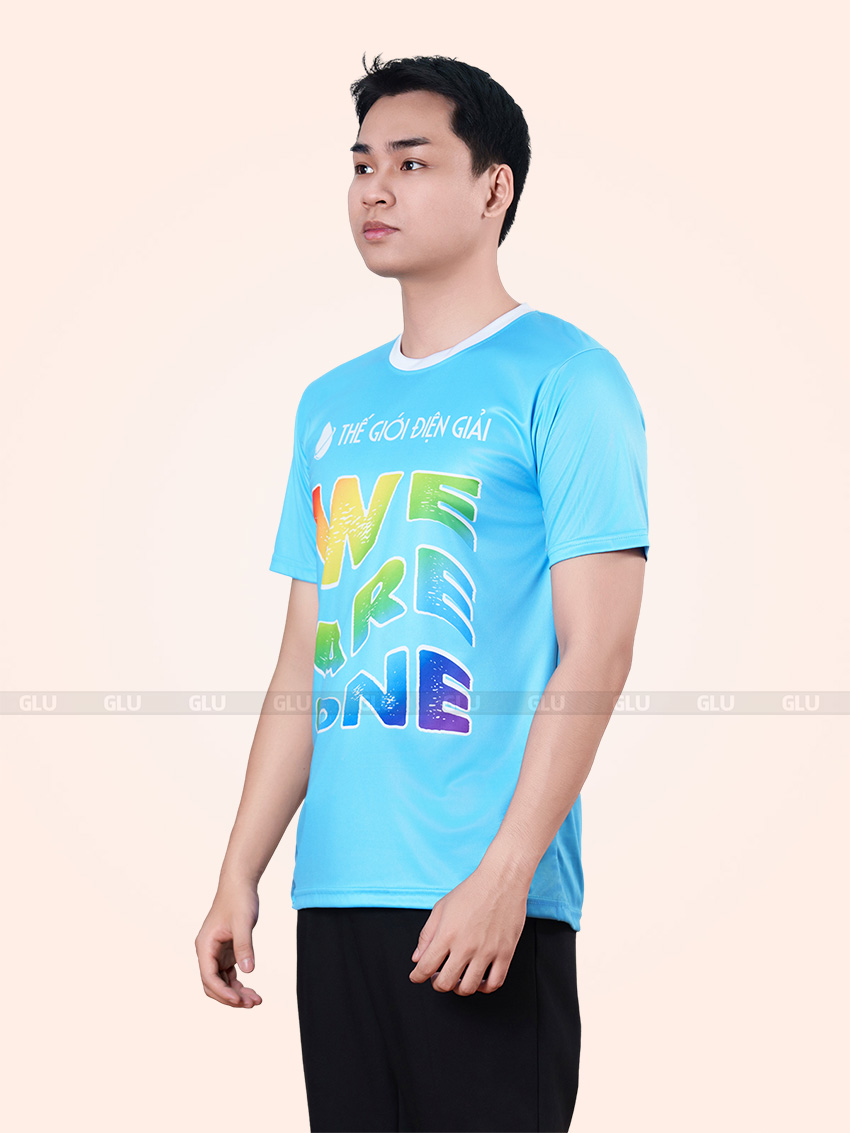 Tông xanh cyan được sử dụng làm màu chủ đạo, kết hợp cùng cổ tròn bo viền trắng tạo điểm nhấn trẻ trung, phù hợp với môi trường năng động hoặc sự kiện nội bộ. Thiết kế in chuyển sắc “WE ARE ONE” nổi bật giữa thân áo, tạo hiệu ứng thị giác mạnh mẽ nhờ bảng màu chuyển từ vàng sang xanh lá – xanh dương – tím than. Logo THẾ GIỚI ĐIỆN GIẢI được in tại ngực trái bằng công nghệ PET chuyển nhiệt, cho độ bám dính cao và sắc nét, giữ màu tốt ngay cả khi giặt nhiều lần. Form dáng thể thao ôm vừa, tay ngắn, phần sườn được may tỉ mỉ, hạn chế nhăn nhàu và thấm hút tốt nhờ chất liệu vải cá sấu thoáng khí.